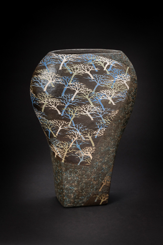 《象嵌泥彩樹林文花器》高さ51cm、22×30.5cm