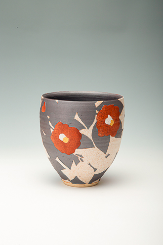 《花文広口壺 椿》高さ21.4cm、径20.2cm
