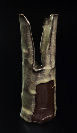 《象嵌釉彩樹林文扁壺》高さ28.9cm、75.8×12.5cm