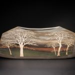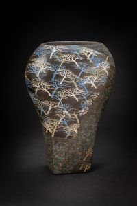 《象嵌泥彩樹林文花器》高さ51.7cm、17.4×36.3cm