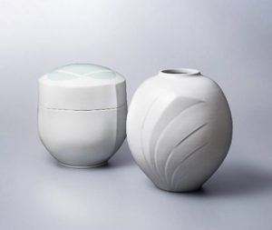 X年後展 vol.10 in 市之倉さかづき美術館 ギャラリー宙 2026 » リリース華やぎの工芸展_ページ_1_画像_0002-2 ピーター・ハーモン (左)《掛分合子》高さ29.7cm、27.3×27.3cm 《彫刻白磁壺》高さ31.5cm、29×29cm